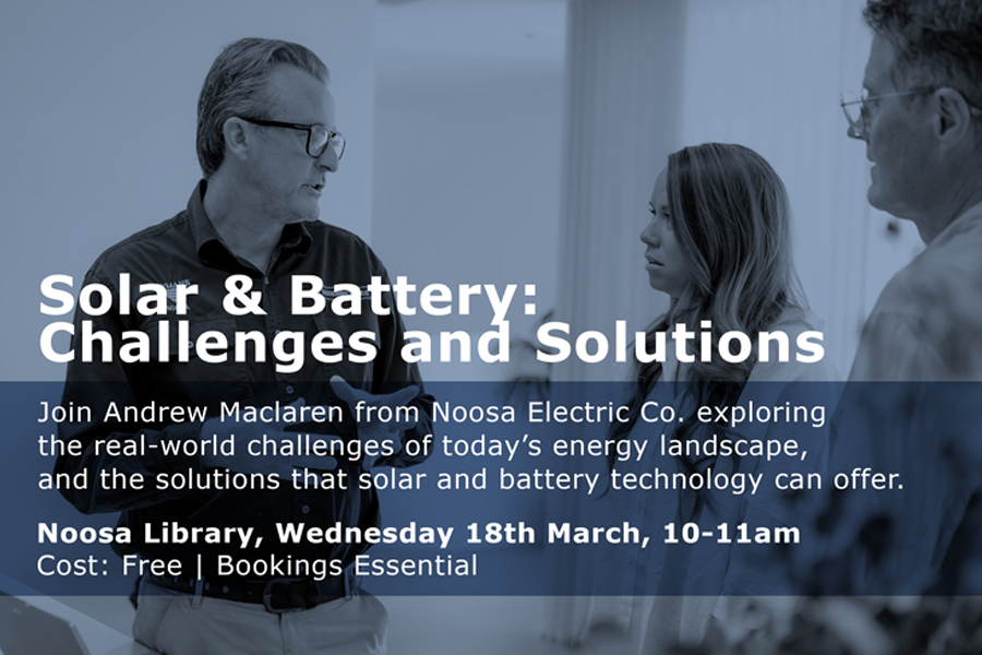 Learn more about solar and batteriesInterested in solar and batteries? Join our presentation in the Noosa Library, or come along to our on-site tour of a recent residential battery installation and check out the system in action.